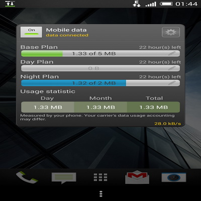 Koneksi scheduler yang tersedia untuk periode waktu setup ketika koneksi data yang tersedia. Misalnya Anda dapat mengatur aplikasi sehingga koneksi data hanya tersedia pada akhir pekan. Widget diaktifkan secara otomatis dan aplikasi berjalan di sistem bar untuk memberitahu Anda jika anda telah melebihi jumlah yang ditetapkan dalam hitungan megabyte.