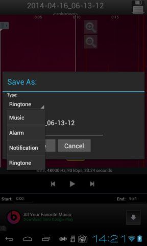 Setelah memilih salah satu, Editor gelombang terbuka di mana Anda dapat mulai mengedit trek. Setelah selesai klik tombol Save dari atas dan Anda akan ditawarkan untuk menempatkan potongan sebagai nada dering, alarm, pemberitahuan atau ekspor sebagai musik.